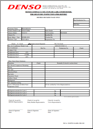 Pre-Delivery Inspection is a standard procedure for all supply of Denso air conditioning system, our PDI team is qualified by Denso Singapore
